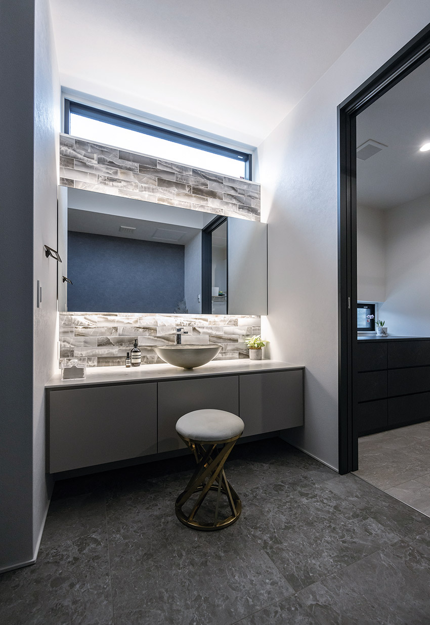 ホテルのような空間をイメージして、質感豊かな素材を用いました。LDKの床にはグレーの大判タイルを敷き、テラスとのつながりを表現。造作の洗面化粧臺はアクセントタイルと間接照明でコーディネートしました。