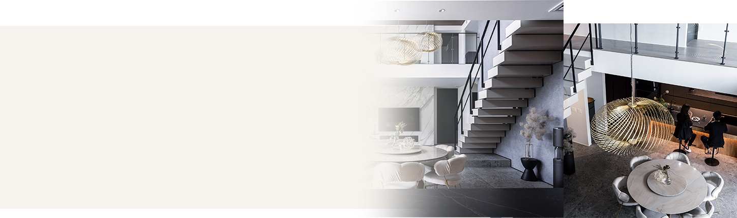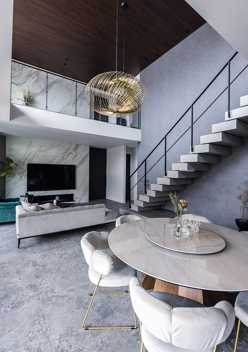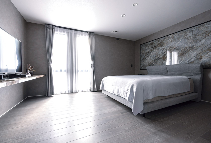 石の素材感がお好きだというKさまご夫妻。そこで、自然石のような趣のある160×320㎝の大判タイルでLDKにアクセントをつくりました。主寢室にも色違いを展開して、素材のもつ圧倒的な存在感で部屋全體の雰囲気を引き締めています。