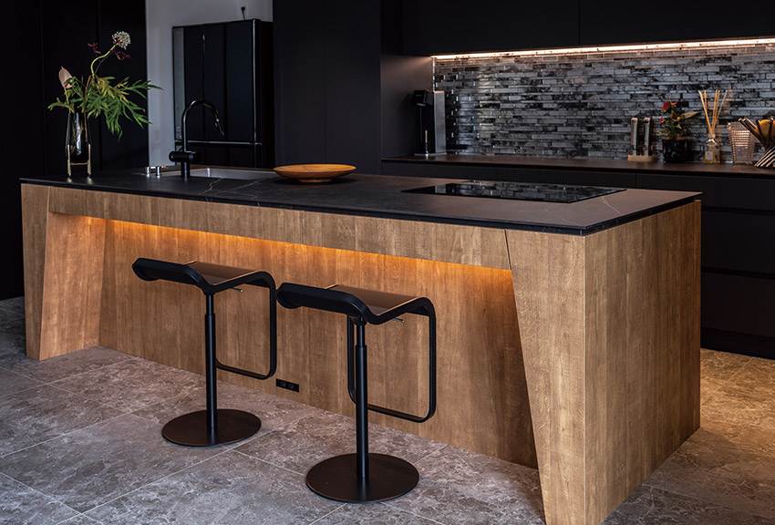 Sさんが選ばれたクチーナのキッチンは、シックな黒と木目を組み合わせたゲート狀のデザイン。気の置けないご友人が訪問されるとスツールに腰掛けていただき、料理を作りながらおしゃべりを楽しんでいらっしゃるそうです。