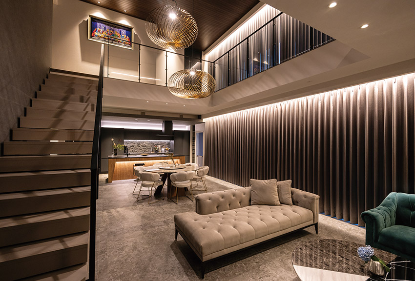 リビング南側の開口部は、カーテンを全て閉じた時の美しさにもこだわりました。艶のある生地を選び、カーテンボックス內部に埋め込んだ間接照明によって、空間にさらなる奧行きを生み出します。
