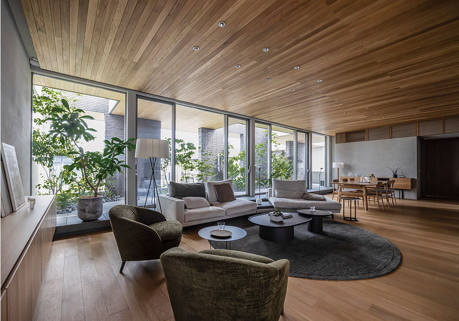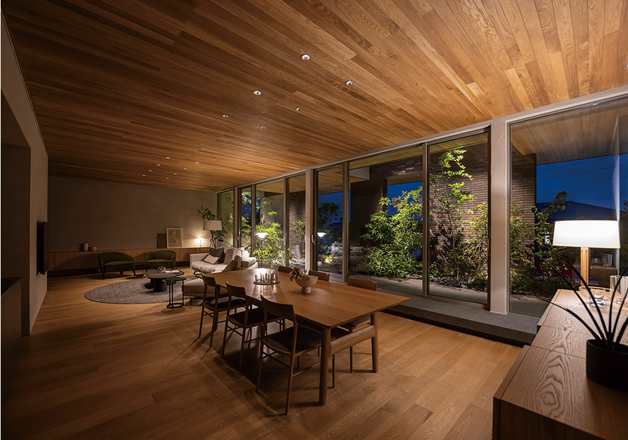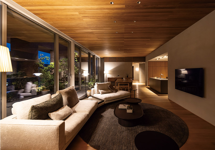光の反射を考慮して程よい明るさとなるよう、內(nèi)裝材の色を選びました。夜には照明の効果で、晝とは異なるリラクシングなムードを演出します。ご家族一緒にリビングで過ごす時(shí)間が増えたと伺い、うれしく思っています。