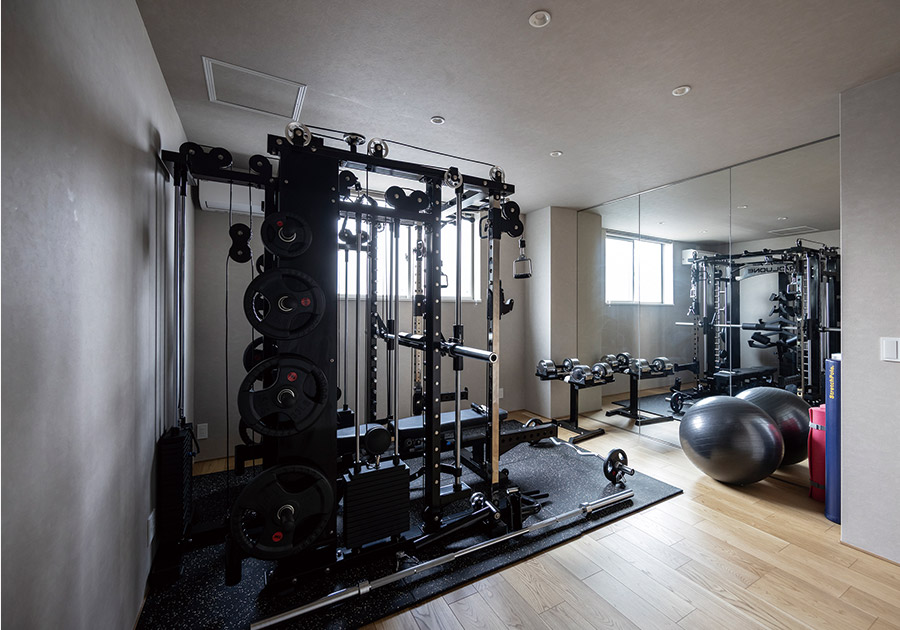 Yさん用のジムスペースを1階の北側(cè)に設(shè)置。穏やかな自然光が入る室內(nèi)で心地よくトレーニングができます。壁の一面は鏡張り。フォームのチェックやモチベーションアップに活用いただけます。