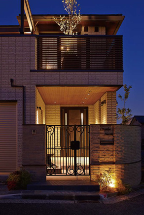 外観は街に溶け込むようナチュラルな印象に。R形狀の門塀や窓の化粧枠がシンプルな中にも変化をもたらし、個性を演出しています。
