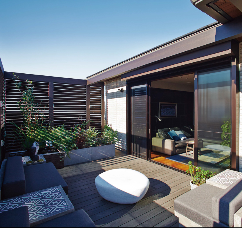 生活の中心となるLDKは2階に。リビングから続くバルコニーには奧行きがあり、周囲の視線が気になりません。ソファやテーブル、小さな水盤まで設置したバルコニーは、青空の下でくつろげるゆったりとした空間に仕上がっています。