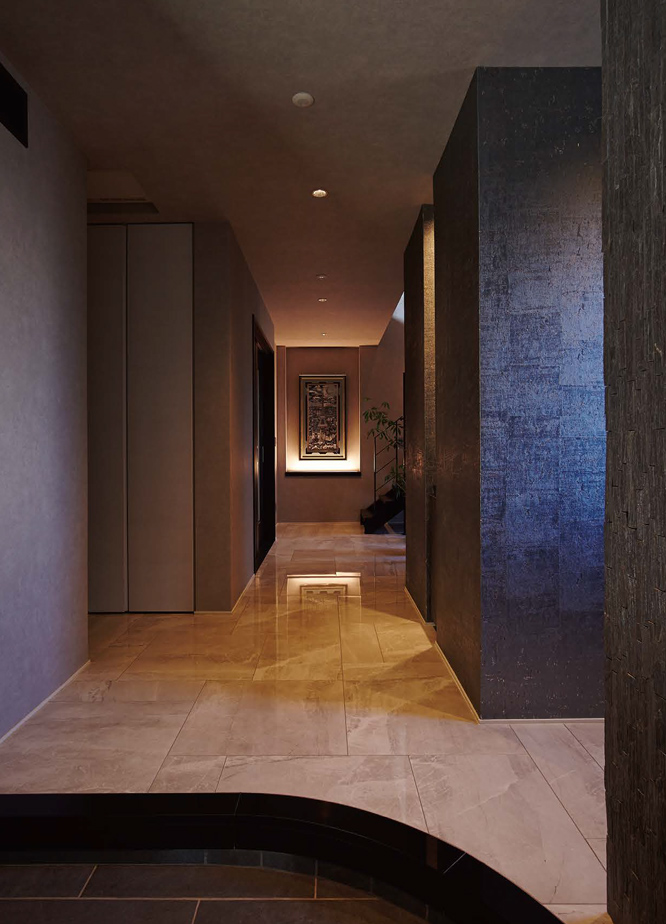 ナチュラルな印象の外観とは対照的に、玄関に一歩足を踏み入れると高級感漂う別世界が広がるOさま邸。旅行が趣味で非日常を感じる暮らしを好まれるOさまは、自宅でありながら上質な雰囲気に浸れるくつろぎの住まいを築かれました。