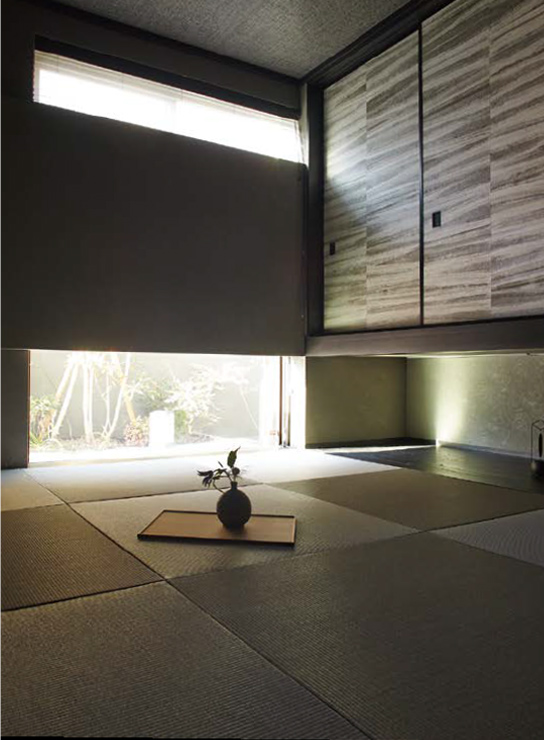 ゲスト用に設けたモダンな和室。坪庭に臨む地窓を取り入れることで採光量を調整し、しっとりした雰囲気に