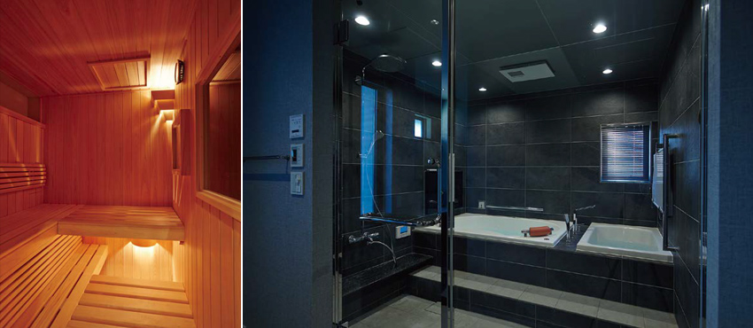 サウナが併設された、広々とした浴室。4.5畳の広さに加え、ガラス張りで開放感を演出しています