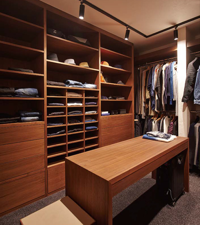まるでセレクトショップのようなウォークインクローゼット。荷物を広げて旅行の準備ができるよう中央にテーブルを設置
