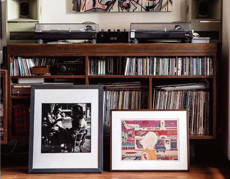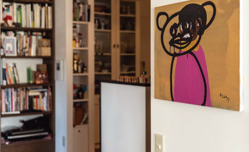 谷口さんのご自宅のリビングはギャラリーカフェのような趣。部屋の顔となる壁には大きく印象的なアートを。どこで出合い、どんな作家なのか、一つひとつの作品との思い出を語ってくださいました(artist:正面/あきやまりか)