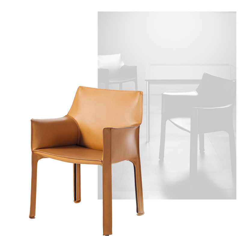 マリオ?ベリーニがペン1本を片手に工場に赴き、職人との対話の末に生まれたというキャブチェア。人間の體の延長としてしっくりと馴染むよう、メタルフレームに厚革のジャケットを著せた畫期的なデザインです。獨自の厳しい水準をクリアしたなめし革は、使い込むほどに體にフィットし、味わいを深めていきます。