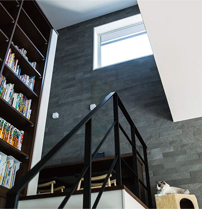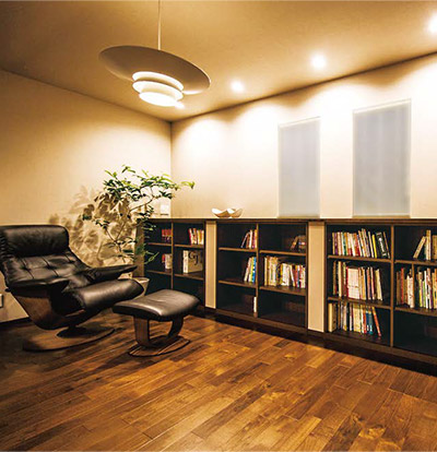 茨城県Tさま邸の2階ホールには、圧迫感のない高さの本棚でゆるやかに空間を區切った「サロン」があります(寫真G)。ご夫妻の共通の友人が集まってにぎやかに過ごしたり、子ども達が好きな本を読みふけったり。吹き抜けによって1階ともつながった、開放感のある空間です。