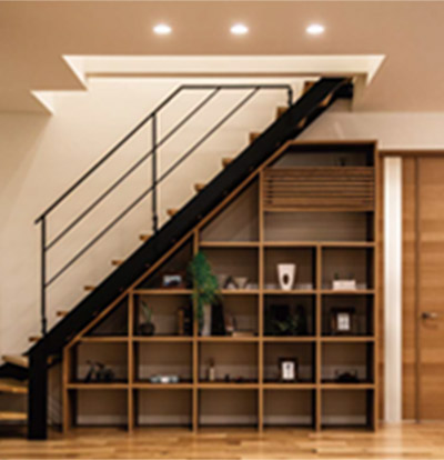 大阪府のMさまは、階段下のスペースを上手に生かして、飾り棚兼エアコン収納を造作(寫真F)。思い出の品や寫真を飾り、ご家族らしさを演出されています。スケルトンの階段とともに、印象的なインテリアをつくり上げています。