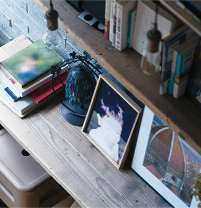 大阪府Kさま邸のダイニングを彩るのは、エイジングの味わいを大切にした壁面収納です(寫真A)。グレーのレンガをバックに、武骨なイメージの鉄骨とリユースの足場材を組み合わせたオリジナルのデザイン。最下段は天板が広めになっており、カウンターとしても使えるよう工夫されています。オブジェや書籍のほか、家族の寫真をバランス良く並べて演出しておられます。