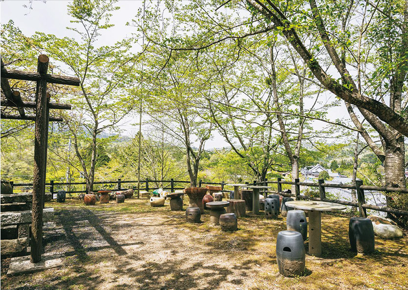 展望臺(tái)に並ぶベンチやテーブルは、陶蕓作家の作品。伊賀の里を見(jiàn)下ろしながら一息つけるとっておきの場(chǎng)所