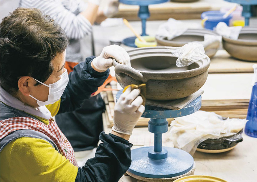 鍋本體に取っ手をつける工程。雙方の水分量が異なると強(qiáng)度に支障が生じるため、乾燥具合を見(jiàn)極めながら作業(yè)します