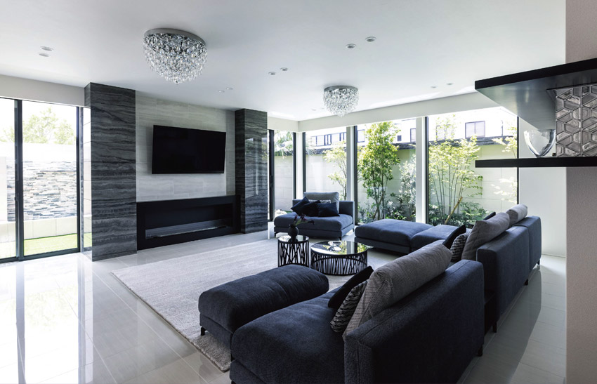 ベージュ色の外壁タイルを基調にまとめた外観に対し、リビングのインテリアは白と黒をバランス良く配したコーディネート。外國のホテルのようなラグジュアリーさを感じさせる空間です。公私にわたりゲストを迎える機會が多いYさまは、座面が広く背面のアーチが美しい大型のソファを選ばれ、ゆとりをもって多くの來客をもてなせる応接間としても機能させています。