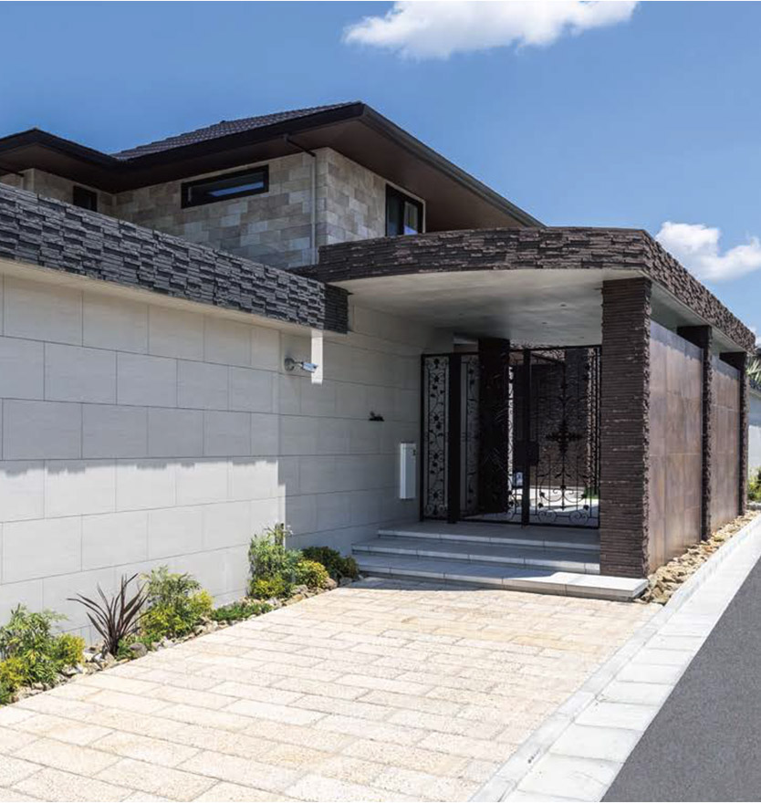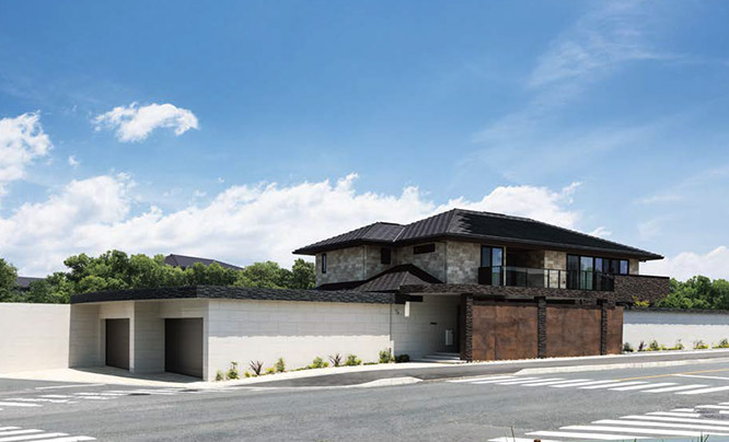 南西角地に映える優美なシルエット。堂々の風格をたたえるYさま邸には4臺駐車可能なボックスガレージと、120坪を超える邸宅が配置され、外観にはまるで迎賓館のような格調の高さが感じられます。