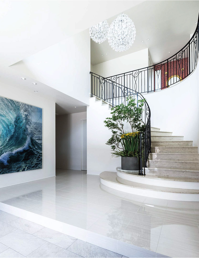 玄関ホールの壁面を飾るダイナミックな波のアート作品は、パノラマ風景作家ピーター?リック氏の作品。設計段階から飾る場所を検討されました