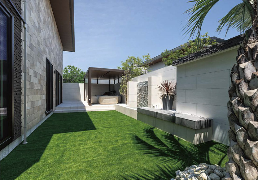 「孫が大きくなったら庭で遊ばせ、ここから眺めたいですね」とYさま。宮崎県から取り寄せたココスヤシが、明るい庭に南國リゾートの雰囲気も添えています。
