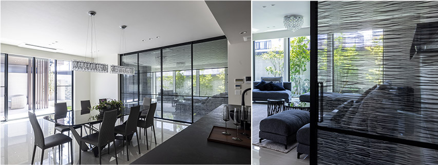 ダイニング?リビング。デザイン性の高い扉が、シーンに応じて空間をゆるやかに區切ります。素材は合わせガラスに布地を挾み込んだファブリックガラス。光を透過させつつ、布地のもつ豊かな素材感がインテリアに柔らかな表情を與えています