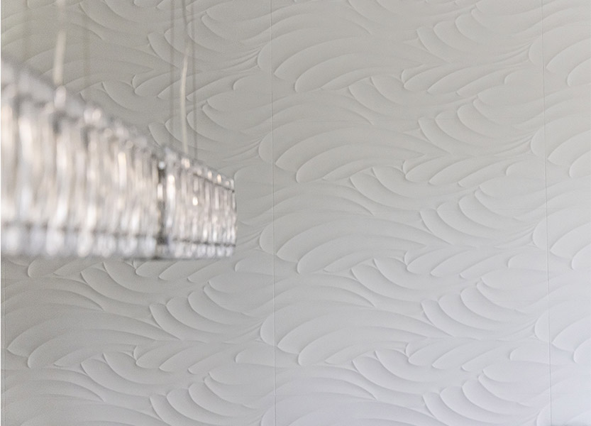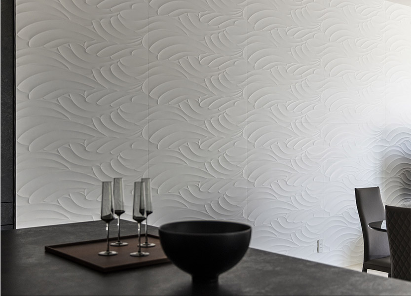 ダイニングの白いタイル壁。自然光を受け、さざ波のようなエンボスが陰影をたたえ、シンプルさが上質な素材感を際立たせます
