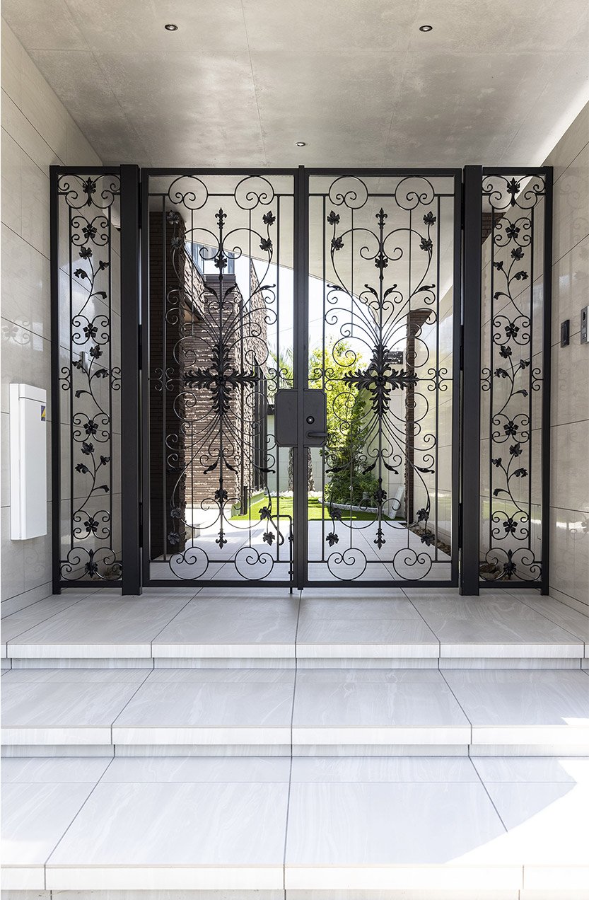 堂々とした両開きの門扉は、優美さと重厚感を併せもつ、繊細な文様のロートアイアン。外壁とアプローチの屋根を一體化させて、特別感をもたせています