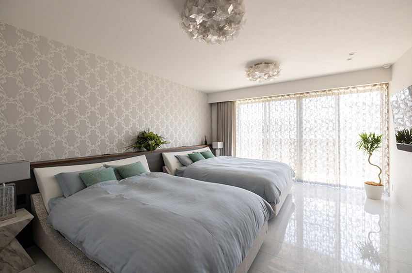 一流ホテルのホスピタリティを我が家に。ダマスク柄のアクセントクロスや花束を思わせるシャンデリアによって、グラマラスな雰囲気を演出しています。つやのある床にレースカーテンの柄が映り込んでドラマチックに
