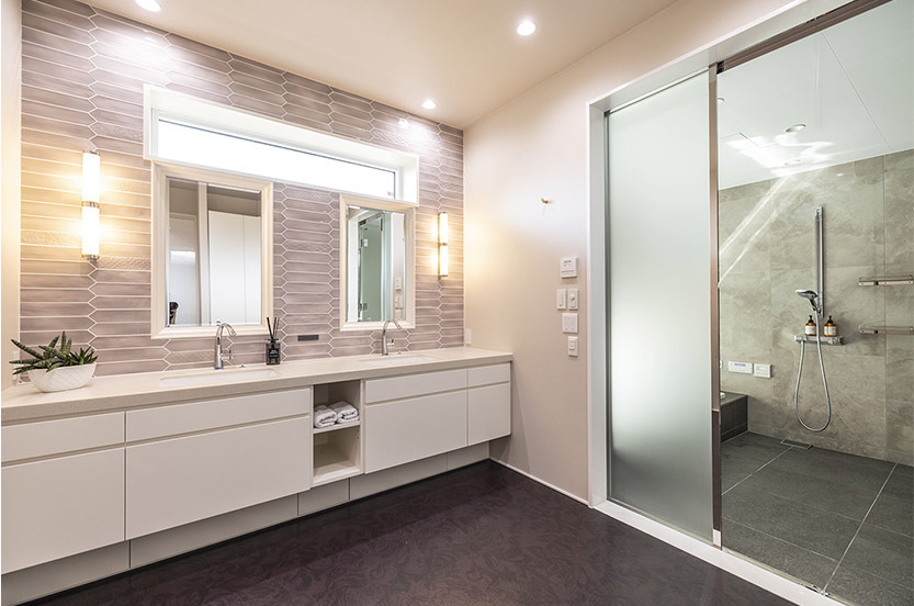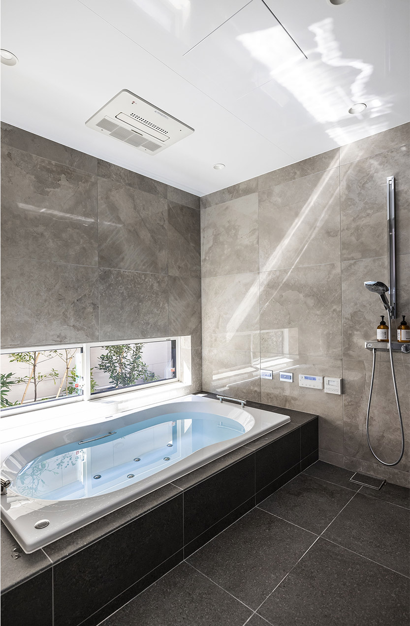 ツインボウルを備えた1階の洗面室とバスルーム。淡いピンクのタイルが上品な華やかさを表現しています。浴室の壁はゴールド感のあるマーブル模様。腳を伸ばしてジェットバスで體を癒やしながら、プライベートな坪庭の景色を楽しめます