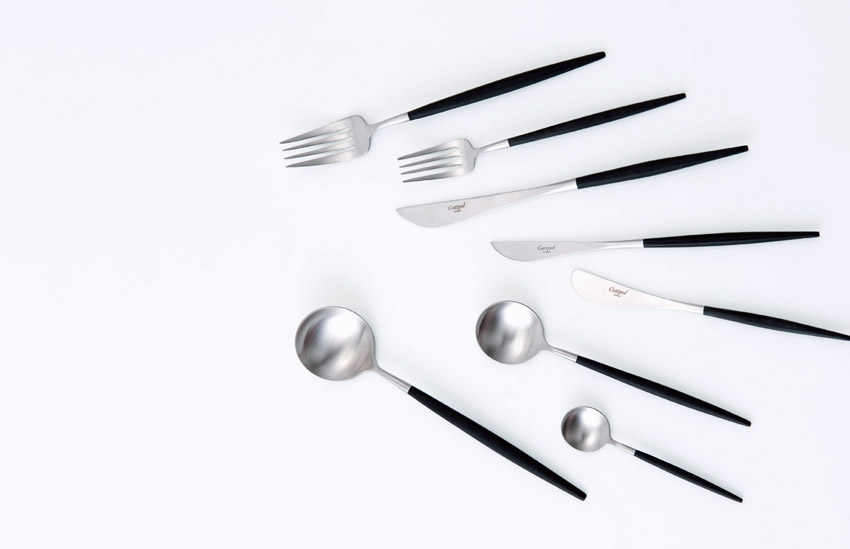 黒い樹脂の持ち手に、光沢を抑えたステンレスのシルバー。そして無駄のないモダンなフォルム。一度目にすると忘れない獨特の存在感でテーブルを彩るフォークやスプーンを、高級レストランなどで手に取ったことがある人も多いのではないでしょうか。このカトラリーブランドの名は「クチポール」。ポルトガル(po)のカトラリー(cut)の會社(L)という意味から名付けられたクチポールは、その名前が表す通りポルトガルを代表する世界的ブランドです。寫真はGOA(ゴア)シリーズといい、アイコニックなモデルとして広く知られています。