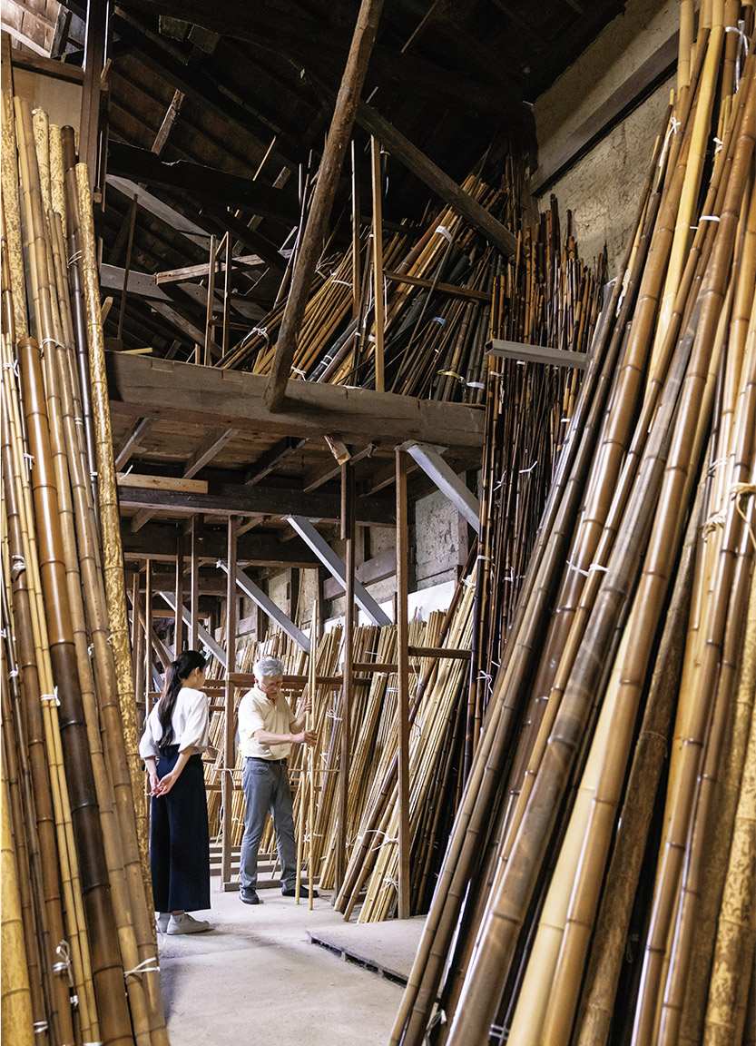 膨大な竹のストック。太さも色味も長さもさまざまな竹が出番を待つ様子は圧巻です
