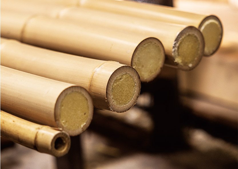 ウレタン樹脂充填(じゅうてん)加工を施した竹。強度、施工性、難燃性が上がり、幅広い箇所での利用が可能になりました