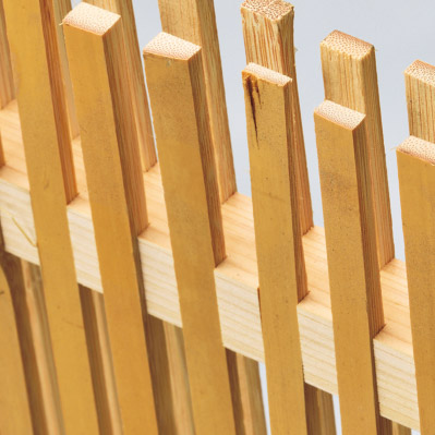 長尺方向に刃を入れて水平に切り落とす加工で、竹ならではの縦線に內部の節が橫線として加わり、リズミカルな印象を與えます。照明や天井、欄間窓、部屋を仕切る建具などに使用可能。竹六が近年力を入れて展開している、竹の新しい魅力を堪能できる加工です。