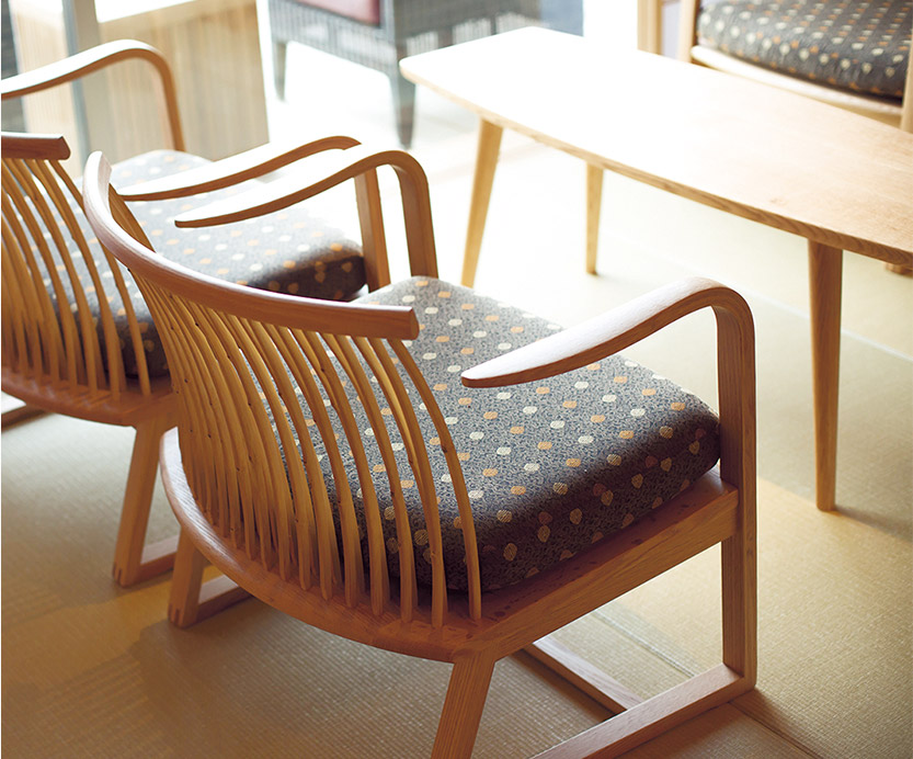 飛騨高山の家具メーカー?柏木工株式會社のGECCA(月華)シリーズにも竹六の竹が使われています。竹のしなやかさを生かし、美しい曲線と家具として十分な耐久性を実現しました。竹六はベッドなど家具の開発も視野に入れているそうです。