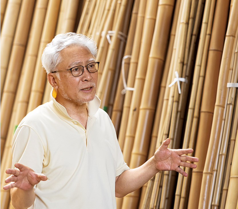 建築の洋風化により建材としての竹の使用が減少する中、創業100年の歴史を守り続ける竹六商店(以下、竹六)。數少ない國內の竹建材メーカーとして、著名な建築家や海外からも注文を受けています。商業施設や店舗、住宅など、建築家やインテリアデザイナー、施主が求める空間のイメージに合わせて多種多様な竹素材を加工して提供するため、倉庫にある竹のストックは10萬本にも及ぶそう。竹を使ってもらう機會を一回たりとも無駄にしたくないという思いがその數に表れています。「求められたことには必ず応えたい。そして、竹という文化を未來へつないでいくことが私たちの使命です」と代表取締役?田井中さんは話します。