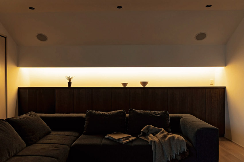 リビングをできるだけ広くするため2階リビングとしましたが、テレビとソファの距離が少し離れすぎるため、バランスをとって造作の収納スペースをご提案しました。北側(cè)斜線制限のために生まれた?jī)A斜部分をうまく利用し、間接照明も取り入れてギャラリーのような雰囲気を演出しています。
