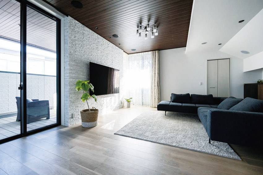 Sさんがこだわられたのは、バルコニーとリビングを一體感のある空間にすること。そのため、リビングの天井の一部に木調(diào)の素材を張り、バルコニーの軒天と続いているように見せる工夫をしました。木調(diào)の天井材には、もともとお持ちだったシャンデリアが調(diào)和しています。
