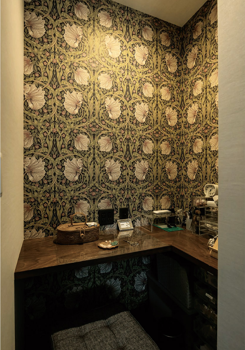 子どもが寢た後、趣味のビーズ細(xì)工を楽しめる場(chǎng)所がほしいというのが、みゆきさんのご希望でした。そこで、主寢室にハンドメイドのためのコーナーを設(shè)けました。お?dú)荬巳毪辘违Ε%辚ⅴ?モリスの壁紙をここにも採(cǎi)用しています。