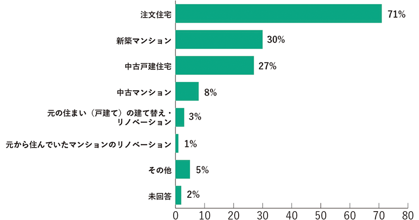分譲住宅を購入した方が比較検討していたのは「注文住宅」(71%)が最多で、7割超が注文住宅と分譲住宅を比較検討したという結果に。やはり「分譲住宅or注文住宅」の二択はよく検討されているようです。