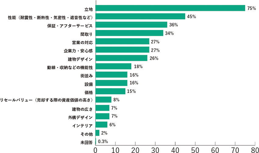 前述の通り「立地」が最重要の條件となり、數字の上では突出しています。立地條件の良い分譲地を確保しているかどうかは、ハウスメーカー選びにおいて大切なポイントとなりそうです。