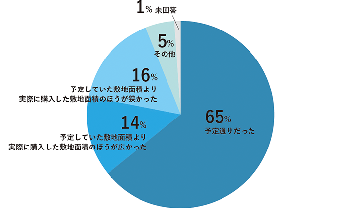 敷地面積のギャップについて最も多かった回答は「予定通りだった」(65%)で、約8割が予定通りか実際に購入した面積のほうが広かったと回答しています。