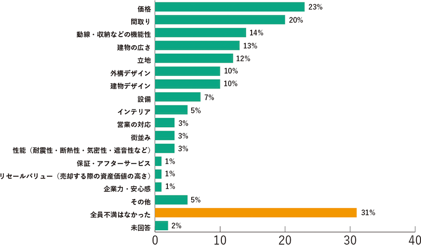 分譲住宅の購入に際して、約7割の方は家族間で何らかの妥協があったようです。「価格」(23%)、「間取り」(20%)の回答が多く、「動線?収納などの機能性」「建物の広さ」と続きました。詳細を見てみましょう。