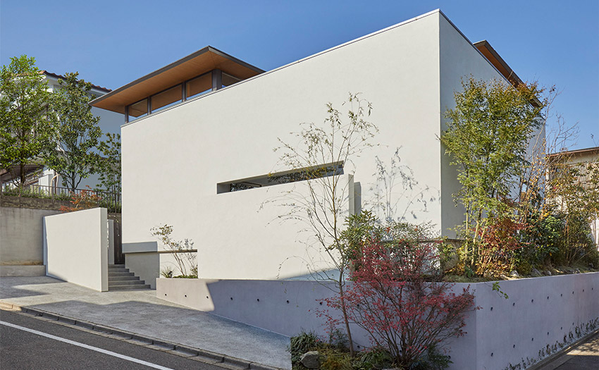 住宅密集地のようにプライバシーの確保が難しい立地では、「外」に閉じ、「內」に開く空間デザインの手法として、建物の中央に中庭を設けるのも一案です。壁や軒先に切り取られた青空を眺めながら、地面に植えられた樹木の木洩れ日や、風にそよぐざわめきを都市の中で體感することもできます。全體を一つの箱としたシンプルなシルエットを、光や陰影を美しく表現するきめの細かい塗り壁で仕上げることで、印象的な外観にデザインしています。