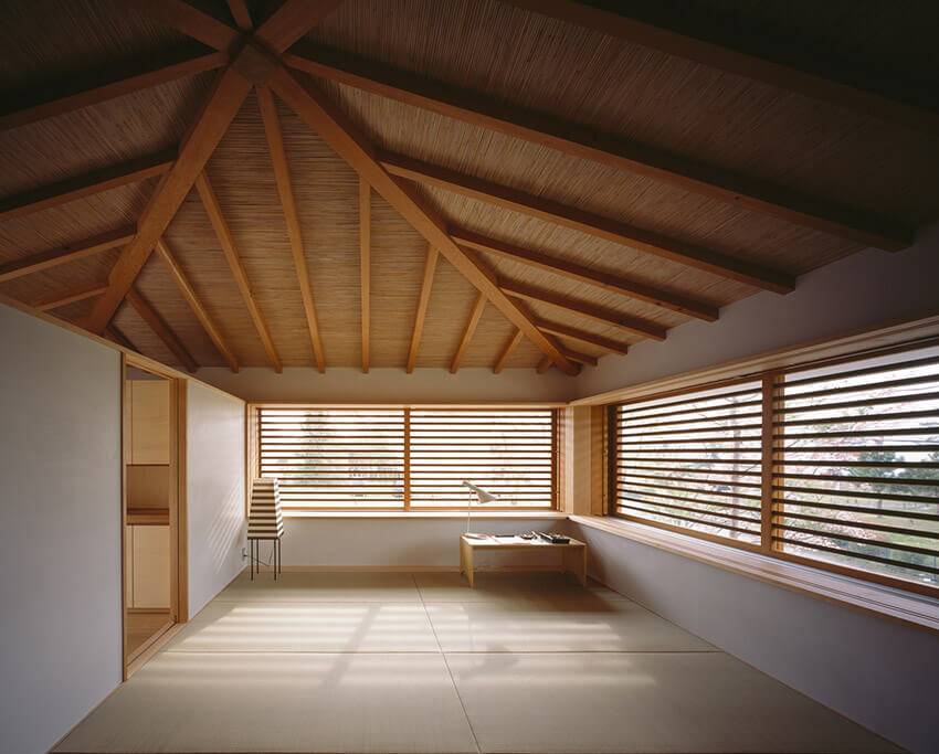 『琵琶湖湖畔の家』 ハナレの大開口に仕掛けたガラリ戸 寫真:西川公朗