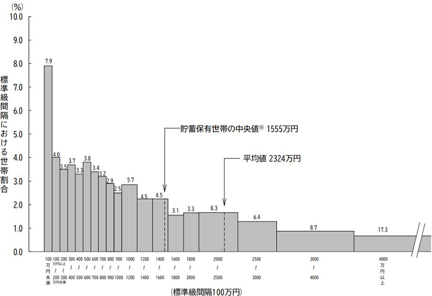 注)標準級間隔100萬円(貯蓄現在高1000萬円未満)の各階級の度數は縦軸目盛りと一致するが、貯蓄現在高1000萬円以上の各階級の度數は階級の間隔が標準級間隔よりも広いため、縦軸目盛りとは一致しない。