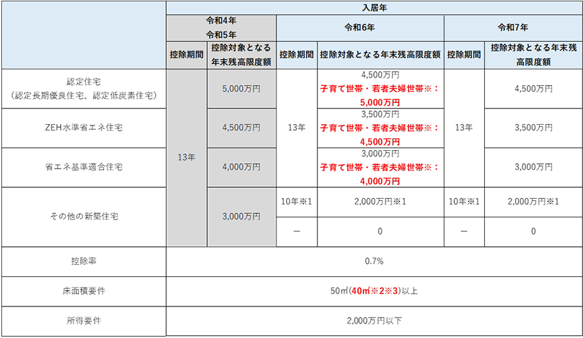 ただし、令和6年度稅制改正大綱で、子育て世帯?若者夫婦世帯は借入限度額が優遇されるよう発表されました。子育て世帯?若者夫婦世帯※3は、認定長期優良住宅や認定低炭素住宅では年末住宅ローン殘高の上限が5,000萬円、ZEH水準省エネ住宅では4,500萬円、省エネ基準適合住宅では4,000萬円、その他の新築住宅では優遇はありません。認定長期優良住宅や認定低炭素住宅では13年間で最大455萬円(ZEH水準省エネ住宅では最大409.5萬円、省エネ基準適合住宅では最大364萬円)が控除されるこの制度は、最大限利用したいものです。