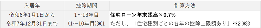 - ※1新築住宅の場合は13年間。ただし、その他の住宅は令和5年12月31日までに新築の建築確認をし、令和6年以降の入居の場合は10年間となります。