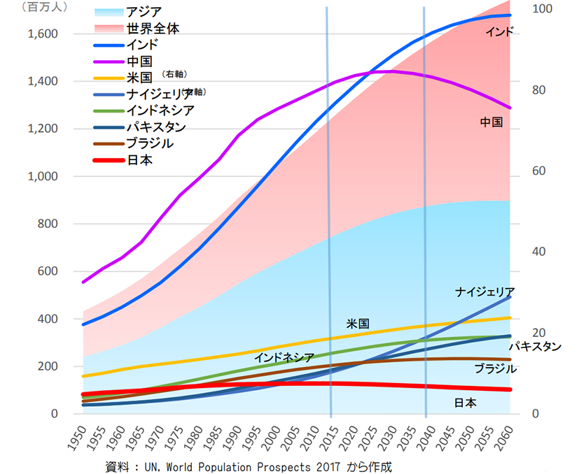 日本の経済が世界各國に比べ伸び率がよくない理由の一つが人口です。國の人口が多いということは、その分衣?食?住が必要となります。それらに関係する企業が増え、雇用も増えます。そうすると消費活動につながり、その結果、経済成長につながります。つまり、基本人口が増えていくと経済は成長するといわれています。日本は1950年代から人口が増え続けていましたが、ピークは2008年の1億2,808萬人となっています。そのピークを越えて徐々に人口が減っています。將來の人口の予測も含めるとかなり下がっていくと見込まれているのが日本の現狀です。一方、世界ではどうでしょうか。世界全體の人口は現在およそ80億人で今後も増えていく予測が立てられています。主な國の人口増減を見るとインド、米國は増えていく予測となっていて、中國はピークを迎え、その後は減っていく予測が立てられています。世界全體で見ると人口増加へ向かっていく予測ですが、経済の成長はどのようになっているのか確認してみましょう。