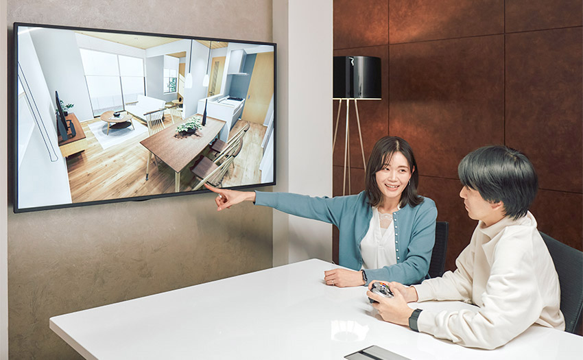 大和ハウスでは今回用意されたすべての間取りに3DVRのデータを用意しました。間取り図に添えてある2次元コードを読み込むと3DVRが現(xiàn)れ、立體的なパースを動(dòng)かしながら部屋の広さや配置、収納量などをゲーム感覚で確認(rèn)できます。一部の営業(yè)所ではVRウォークスルーも利用可能で、これまでかかっていたデータ作成時(shí)間なしに、カスタマイズしたデータが瞬時(shí)に立ち上がり、その場(chǎng)で確認(rèn)できます。