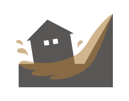 大雨や集中豪雨で山の斜面や崖などの土砂が崩れ落ちる被害。川底の土砂や泥が一気に流される土石流
