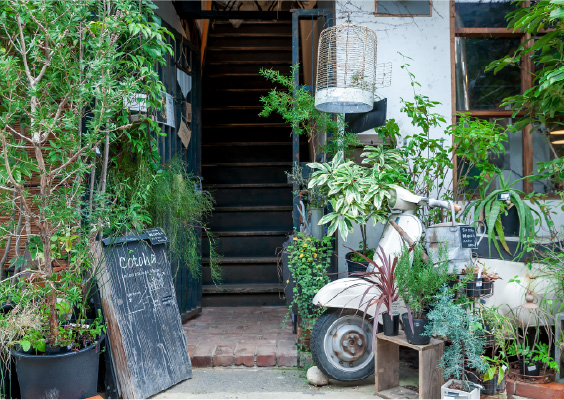 小道沿いにショップが並び、緑に包まれたカフェの奧に入り口がある。